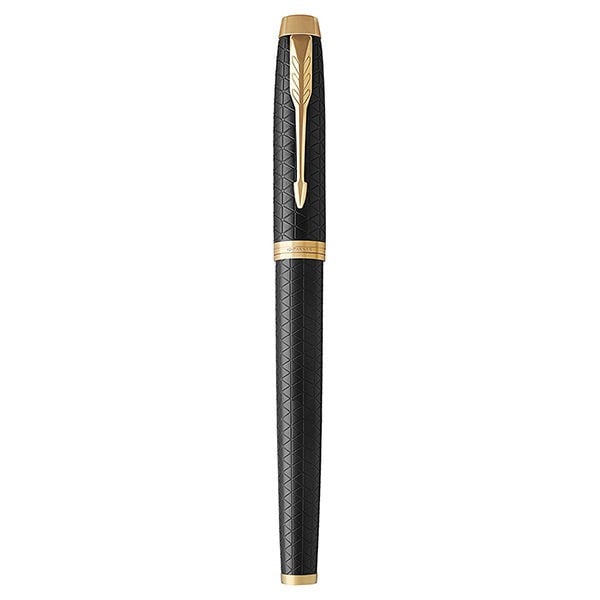 Перьевая ручка Parker IM Premium Black GT из обновленной коллекции IM. Основные особенности нового дизайна: новый зажим-стрела с тремя широкими перьями, укороченная форма торца на колпачке, широкое кольцо на колпачке теперь состоит из 3 соединенных вместе колец, на среднем выполнена гравировка логотипа PARKER. Корпус перьевой ручки выполнен из черного матового анодированного алюминия, прошедшего пескоструйную обработку, с фирменной гравировкой в виде стильного графического орнамента. Отдельные детали дизайна из латуни и алюминия покрыты золотом. Перьевая ручка оснащается пером из нержавеющей стали в новой привлекательной форме. Размер пишущего узла F (тонкий).